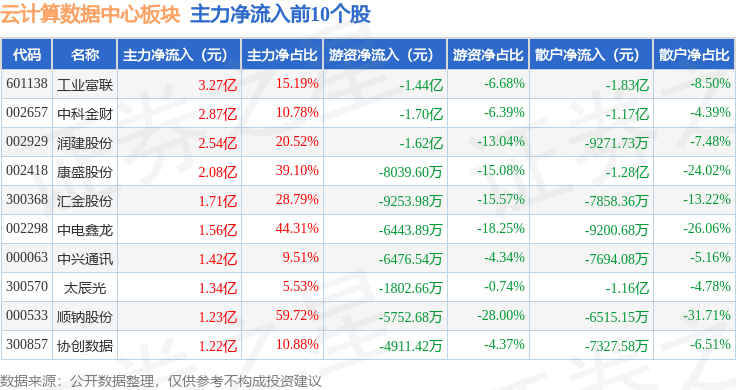从资金流向上来看,当日云计算数据中心板块主力资金净流入21.17亿元,游资资金净流出7.88亿元,散户资金净流出13.29亿元。云计算数据中心板块个股资金流向见下表:
